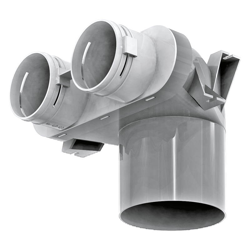Plastový stropný konektor určený na napojenie ventilačnej mriežky na dva rozvody Ø 75 mm v systémoch prívodu a odvodu vzduchu.