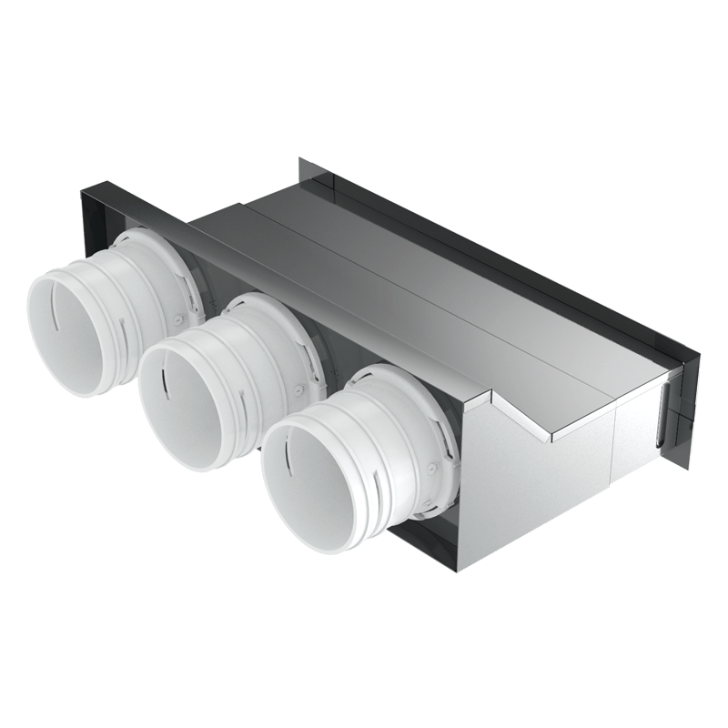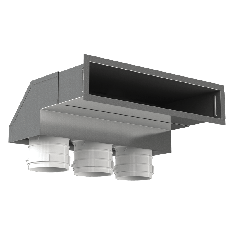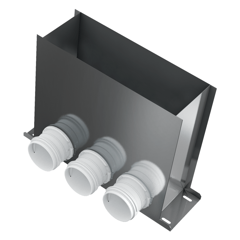 Kovový stenový konektor určený na napojenie ventilačnej mriežky na tri rozvody Ø 63 mm v systémoch prívodu a odvodu vzduchu.