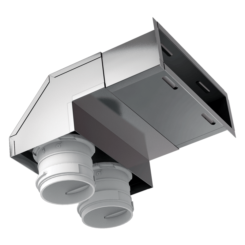 Kovový podlahový konektor určený na napojenie ventilačnej mriežky na dva rozvody Ø 63 mm v systémoch prívodu a odvodu vzduchu.