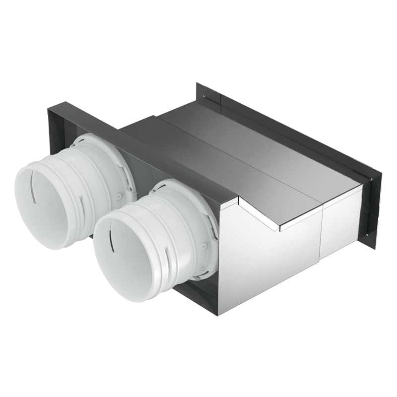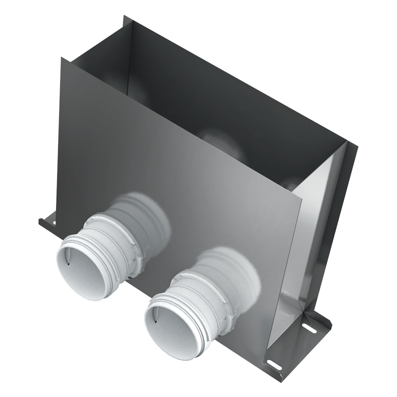 Kovový stenový konektor určený na napojenie ventilačnej mriežky na dva rozvody Ø 63 mm v systémoch prívodu a odvodu vzduchu.