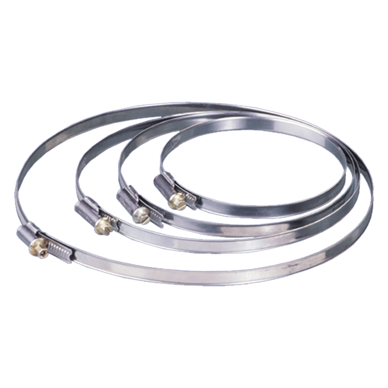 Nerezová sťahovacia páska určená na upevnenie flexibilného kruhového potrubia v systémoch vzduchotechniky.